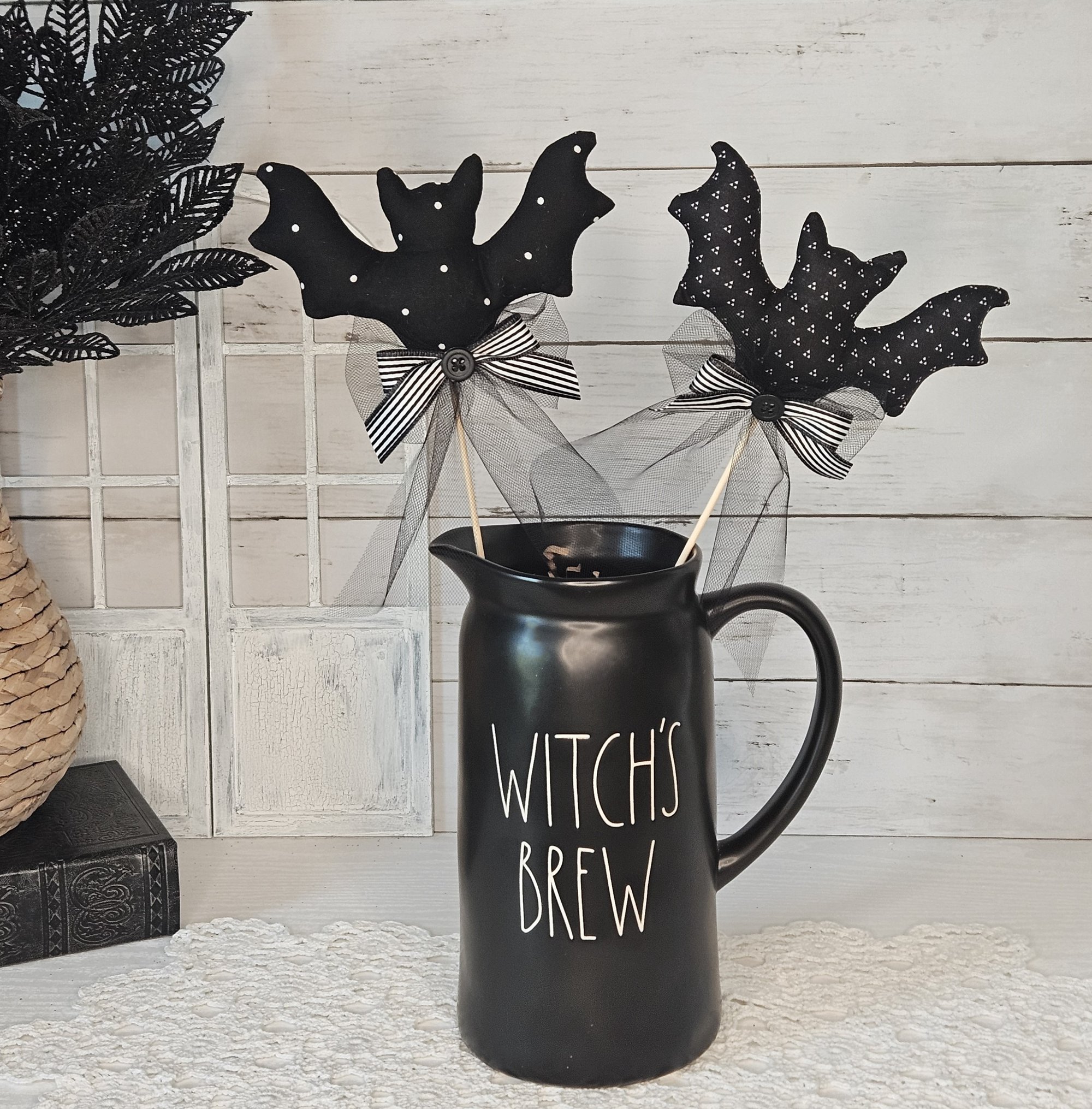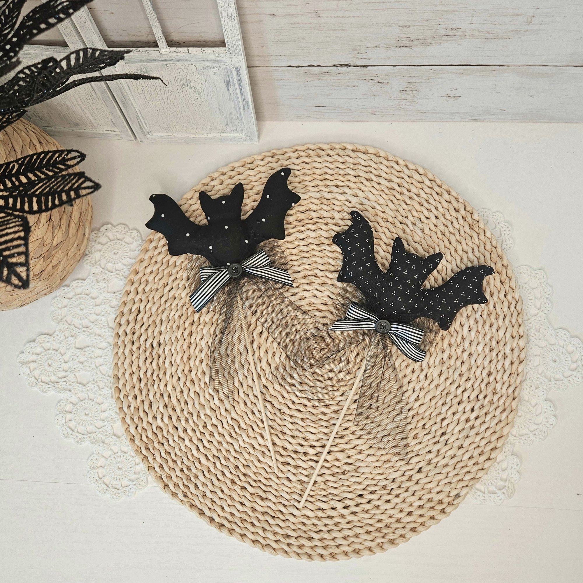 Bats in the belfry! These picks will add a little flutter to your Halloween decor. The set includes 2 plush bats, in different fabrics, set on a wood sticks. Each one has a black tulle bow topped with a striped bow and black button.
