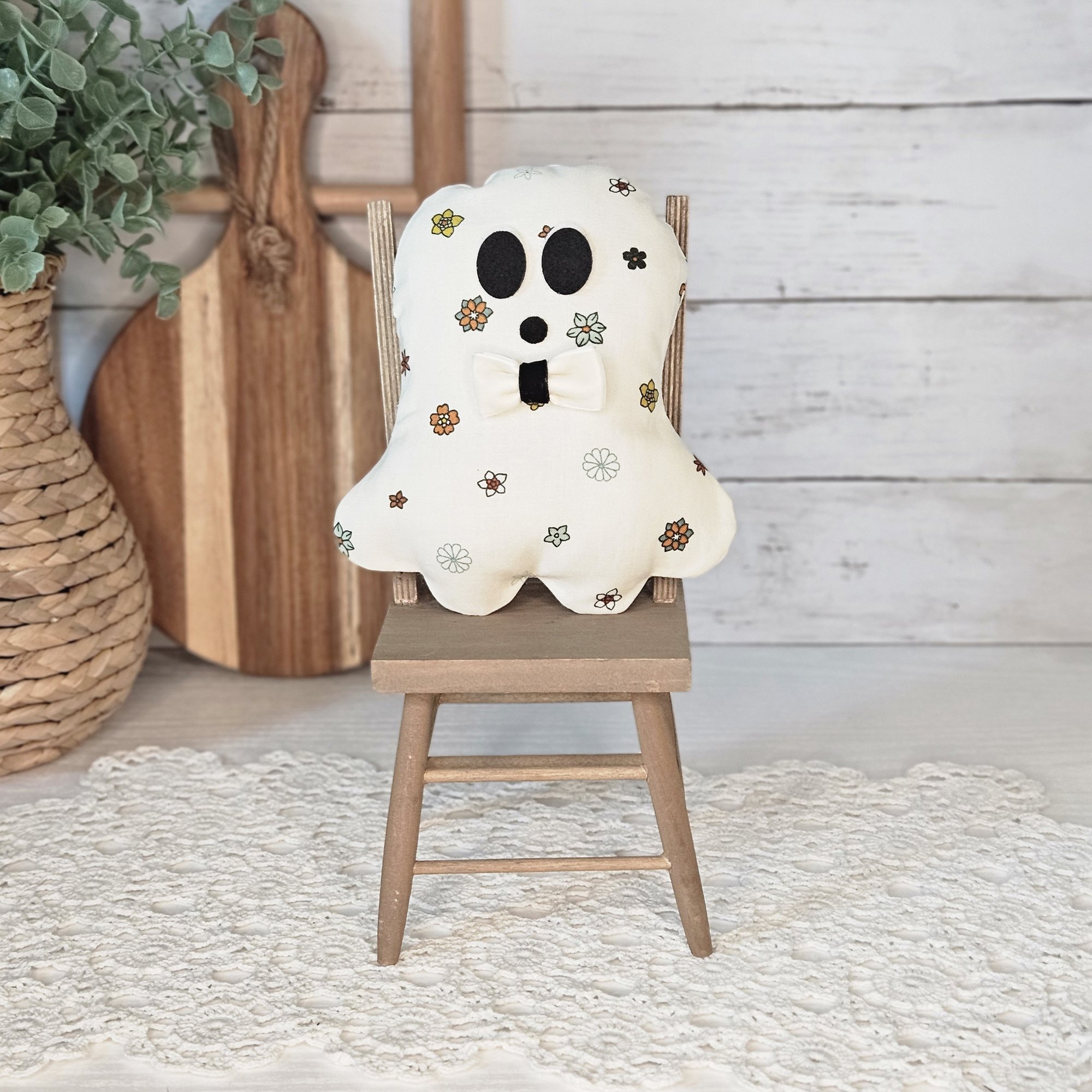 Spooky guys! These little ghost pillows are quite dandy. Each gentleman ghost is done in a fall toned fabric and has a coordinating bow tie.