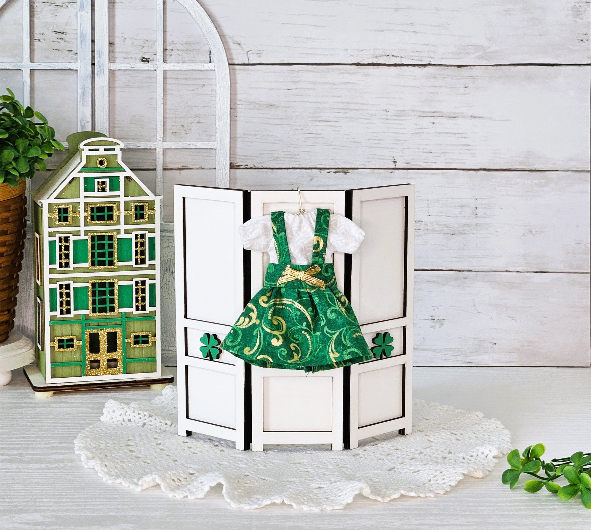Luck be a lady! This mini shamrock dress is a perfect fit for any wee Irish lass. The jumper style set has green and gold swirled jumper overlaying a white peasant blouse in a tone on tone vine print. A tiny gold bow sits at the waist. It is affixed on a handmade gold tone hanger (contact us if you do not want the hanger attached).